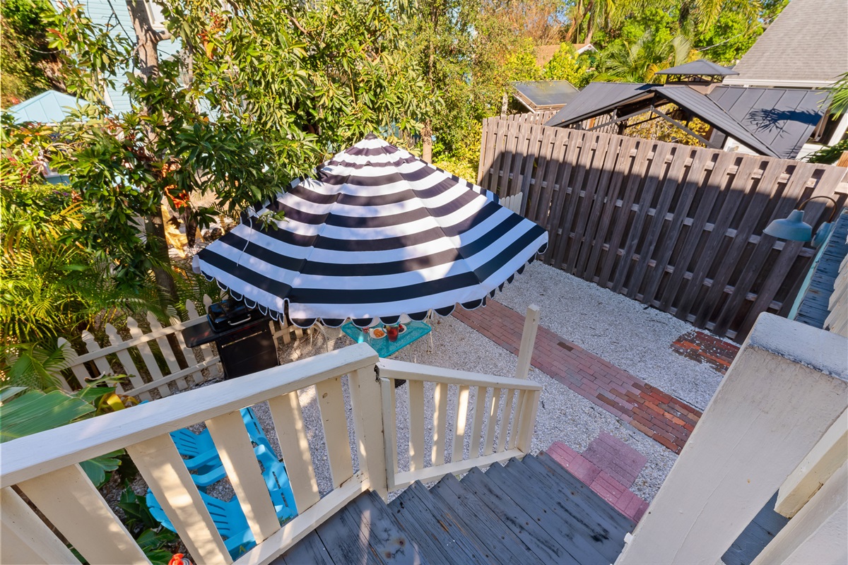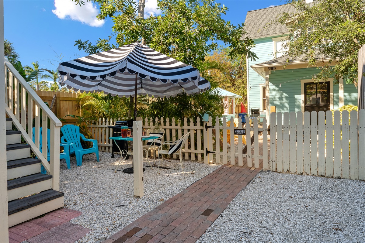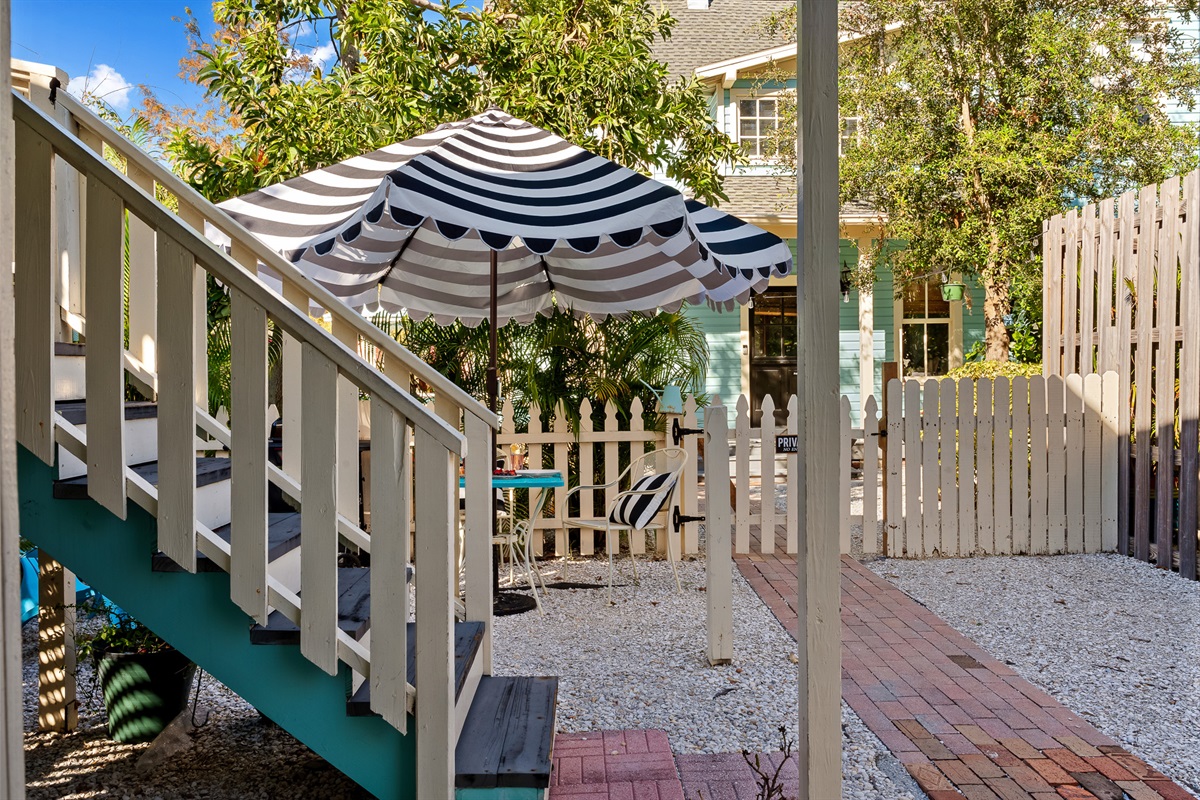 Guests have their own reserved driveway next to the Carriage House. They have private access to the downstairs laundry, toilet and outdoor shower area and the entire upstairs living area. There is a small yard area designated by fencing with a lovely bistro set and umbrella with grill reserved exclusively for guests.