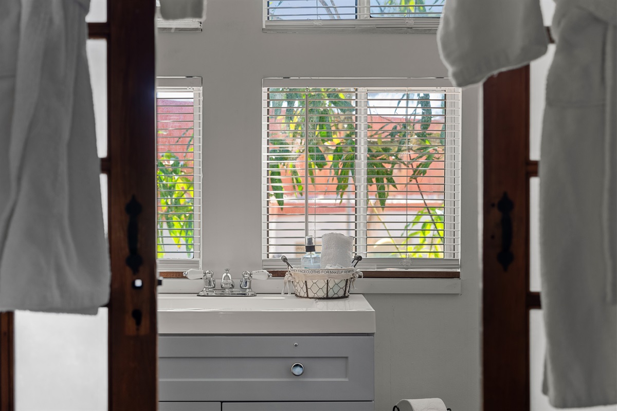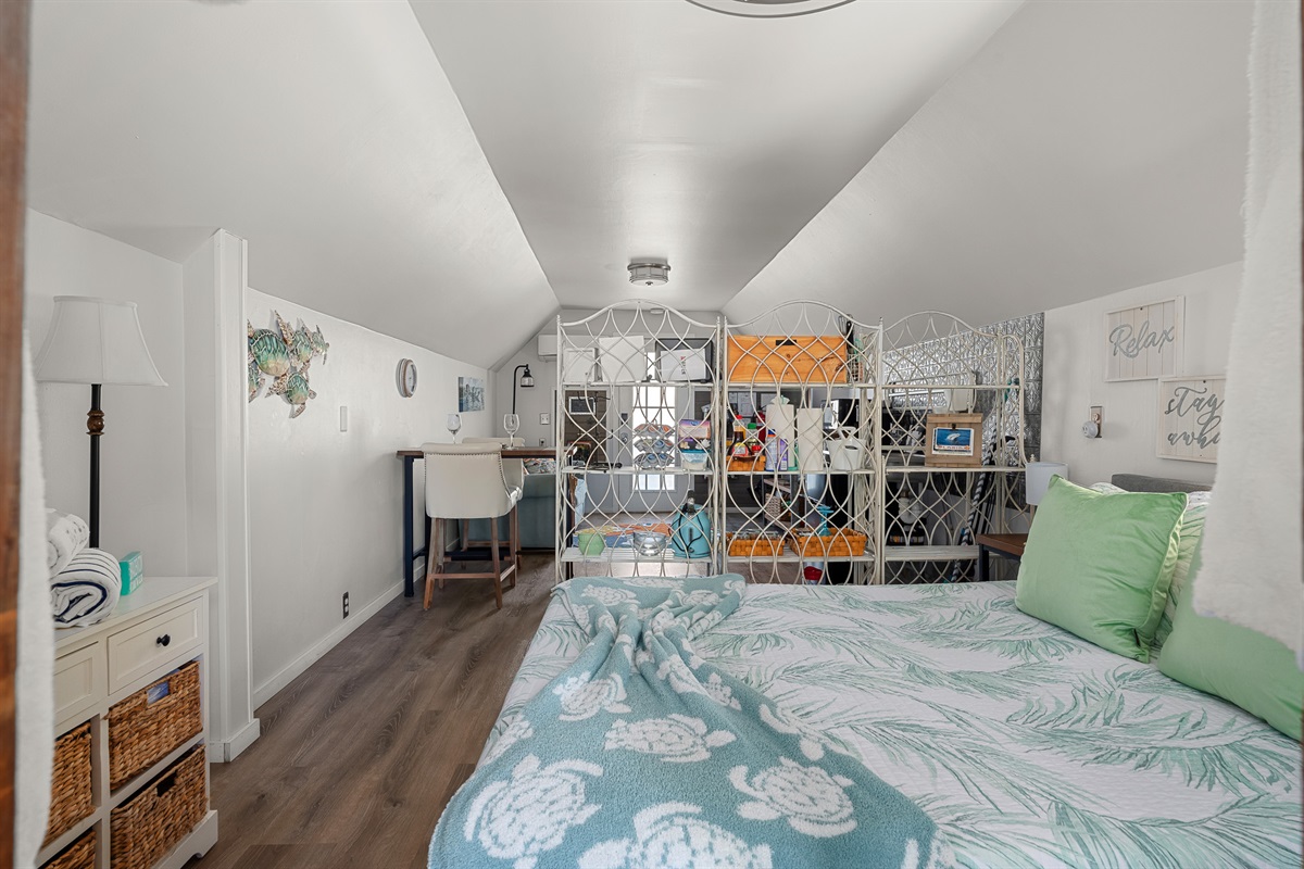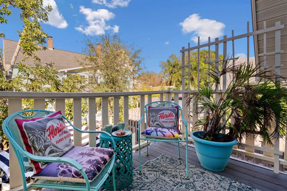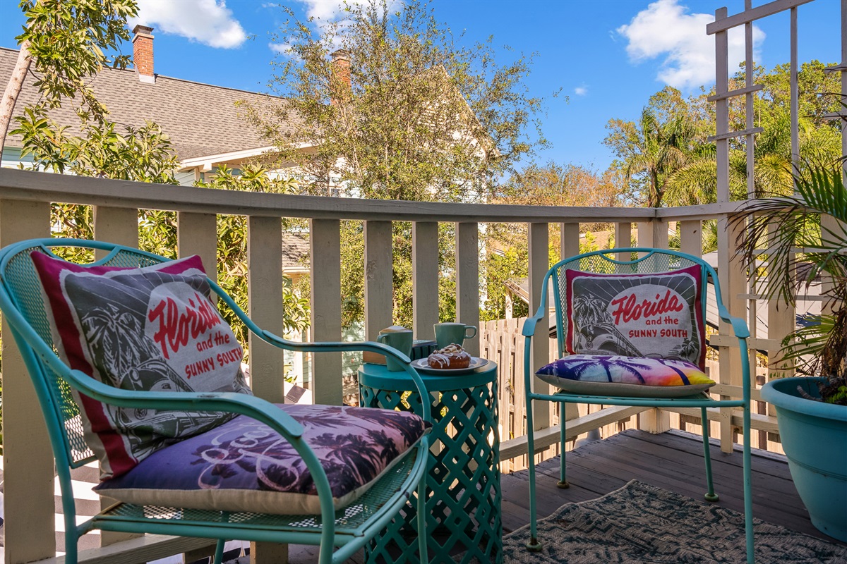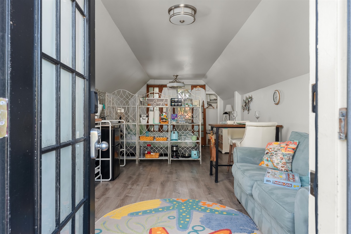 The 1898 Carriage House Retreat is accessed by a flight of 10 stairs to the 2nd floor with private balcony. The main 2nd story living area is an intimate, 400sq. ft. 1 room studio sprinkled with vintage architectural detail. Tiny but very romantic, there is a queen bed & the sofa opens into a full bed allowing 2 (or 3 guests if they are comfortable with the intimacy) to sleep in air conditioned comfort. The bedding, towels & guest robes are sparkling white & fluffy. Pool/beach towels can be found in upstairs closet.