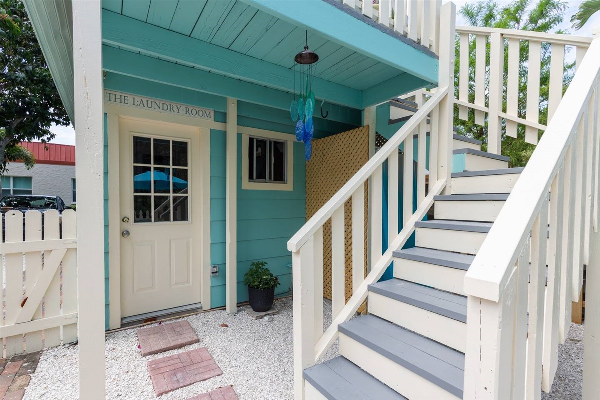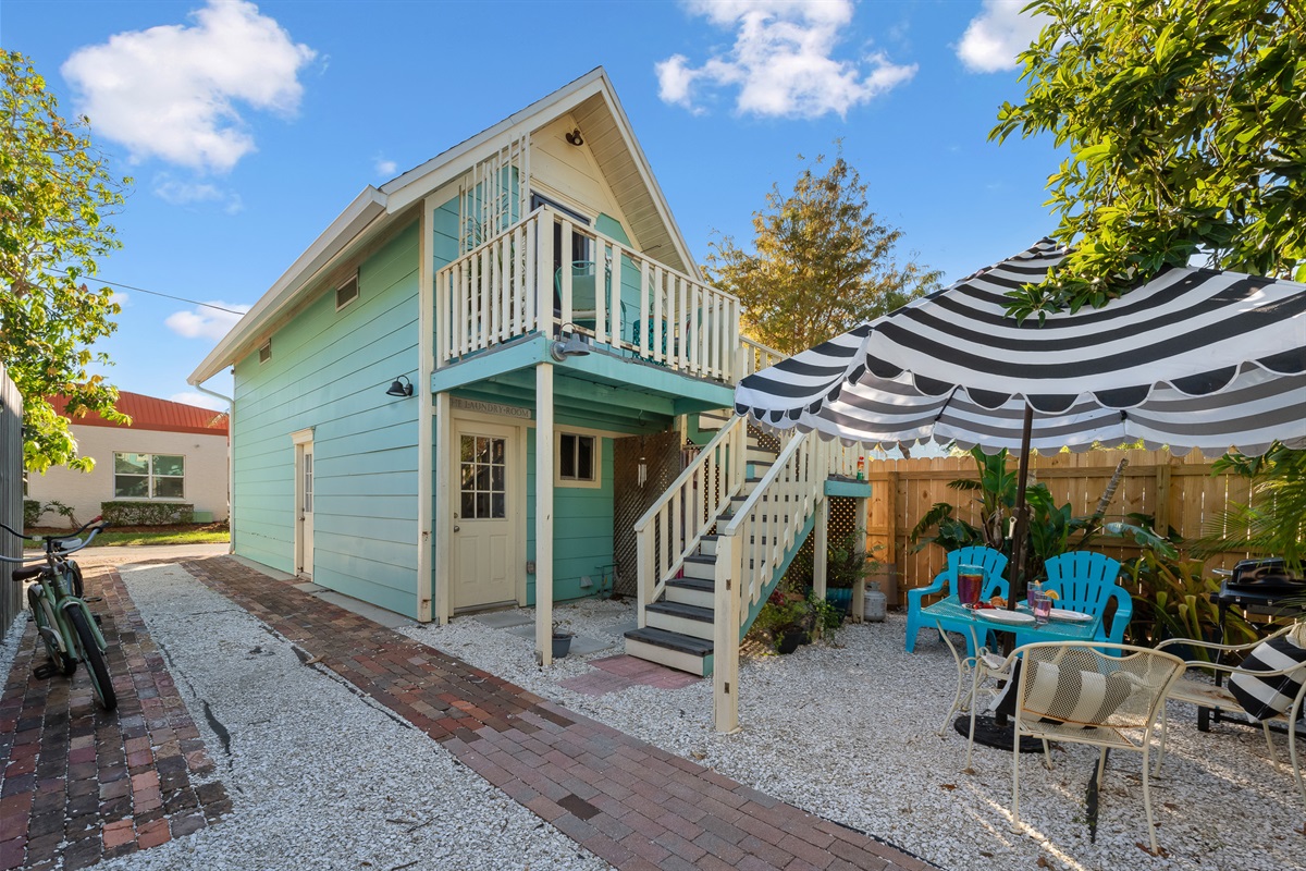 You'll love enjoying morning coffee on the private 2nd floor balcony tree level with the birds. Downstairs, there is a private laundry only for guests with washer/dryer, beach chairs, igloo (8mi. to Manatee Beach & AMI), & a bathroom to use. We also provide 2 bikes to enjoy cruising the Riverwalk & downtown and an outdoor grill if you don't feel like eating out.