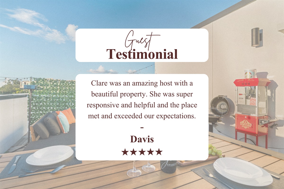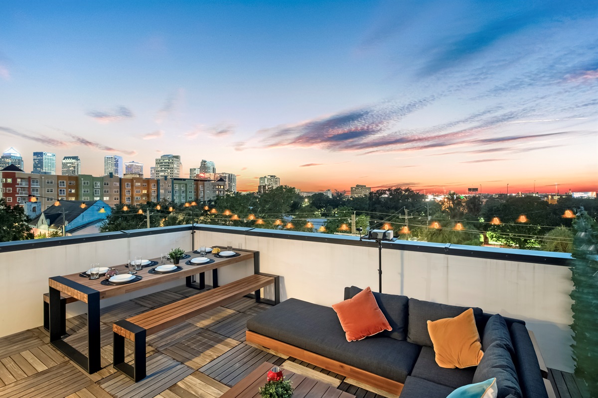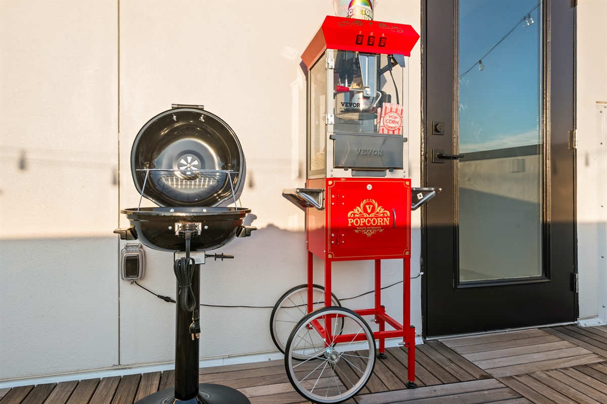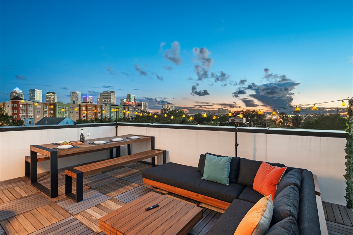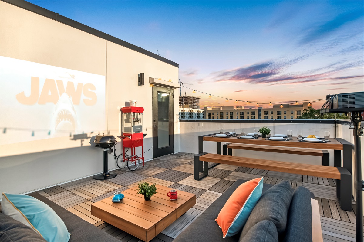 • 🌅 Rooftop Lounge & Outdoor Cinema: The star of the show! Enjoy a corner sofa, outdoor electric grill, dining area, popcorn machine, and a cinematic experience with Tampa’s vibrant, multi-colored houses and stunning sunsets as your backdrop.