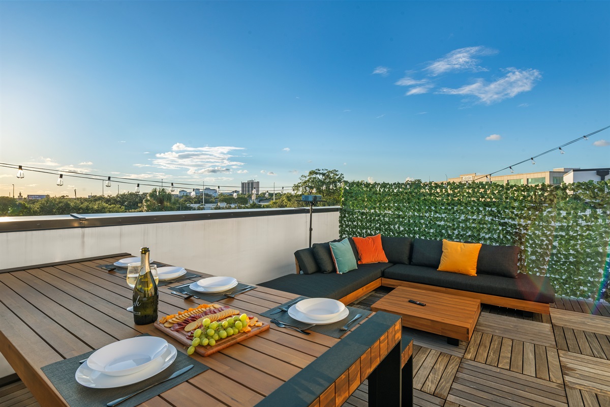 From a state-of-the-art kitchen to a show-stopping rooftop lounge with an outdoor cinema, this townhouse is designed for unforgettable stays. The open-plan indoor dining area, seamlessly connected to the kitchen and lounge, creates a spacious, inviting hub for group gatherings. Whether you’re here to work, relax, or celebrate, this home delivers a luxurious experience in the heart of downtown Tampa.